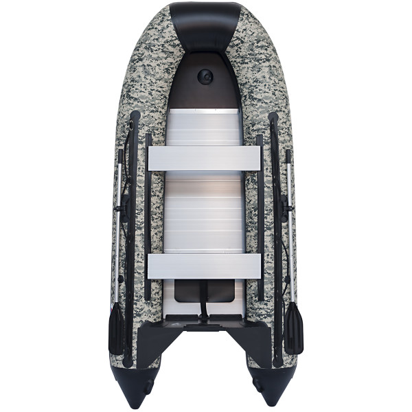 Лодка оснащена всем необходимым: легкие алюминиевые пайолы с антискользящей насечкой и усиленными стрингерами, алюминиевые сиденья из облеченного сплава с нескользящей поверхностью, влагостойкий транец для подвесного лодочного мотора, удобные ручки для переноса лодки, привальный брус с волноотбойником, который защищает баллоны лодки при швартовке.