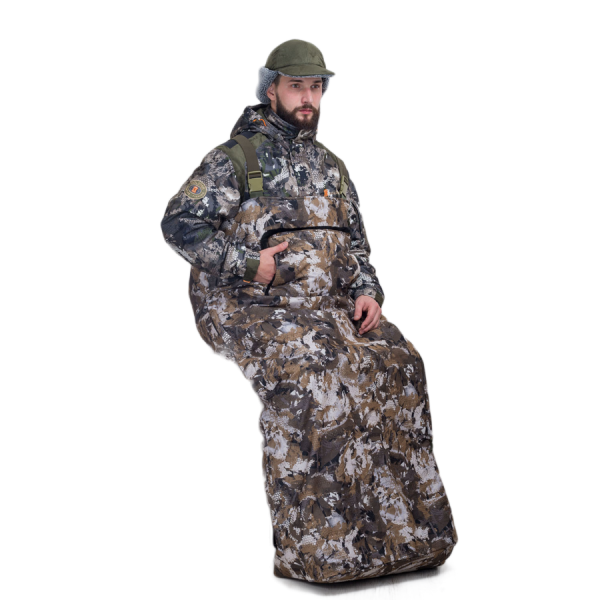 Это теплый мешок для лабаза. Одевается поверх одежды для сохранения тепла. В зоне ступней и сидения встроенные теплоизолирующие слои из вспененного материала. На груди меховой карман-муфта для обогрева рук. Внутренний слой в зоне обуви выполнен из плащевой ткани для защиты от снега и грязи. При использовании мешка с грязной обувью, достаточно вывернуть мешок внутренней стороной вверх и протереть влажной тряпочкой нижнюю часть мешка. В таком виде можно оставить мешок просохнуть. Все вспененные слои легко достаются через карманы для осуществления стирки.